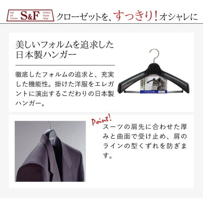 スーツの肩先に合わせた厚みと曲面で受け止め、肩のラインの型くずれを防ぐ、型くずれ防止ハンガーです。