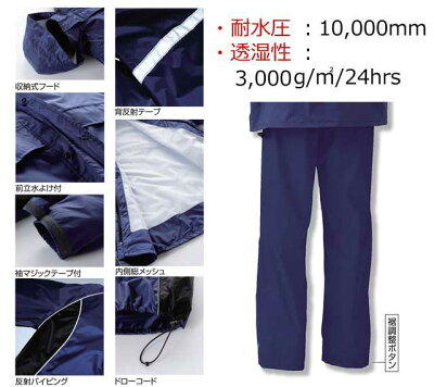 ■ 商 品 説 明 ・カラー29イエロー(蛍光) 40シルバー 49ブラック83ターコイズ 11ネイビー ・素材 : 表/ナイロン100%(PUコーティング)、 裏/ポリエステル100%(メッシュ)・耐水圧 : 10,000mm・透湿性 : 3,000g/平方メートル/24hrs[特徴]収納式フード前立水よけ付袖マジックテープ付反射パイピング背反射テープ内側総メッシュ上着ドローコードパンツ裾調整ボタン 47404 サイズ S M L LL 3L 4L 5L 上着 着丈 75 77 79 81 81 81 81 胸囲 118 122 126 130 136 142 148 裄丈 82 85 88 91 91 91 91 パンツ ウエスト 68〜76 76〜84 84〜94 94〜104 100〜110 110〜118 118〜130 股下 68 71 74 76 79 79 79 ■サイズ5Lは、価格が違いますので別ページになります。