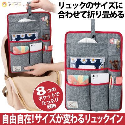 8つのポケットが付いた大容量リュックインで、しかもサイズが自由自在に変わるので、いろんなリュックサックに使えて超便利なんですよ! 1.そのままで大きめリュックに。