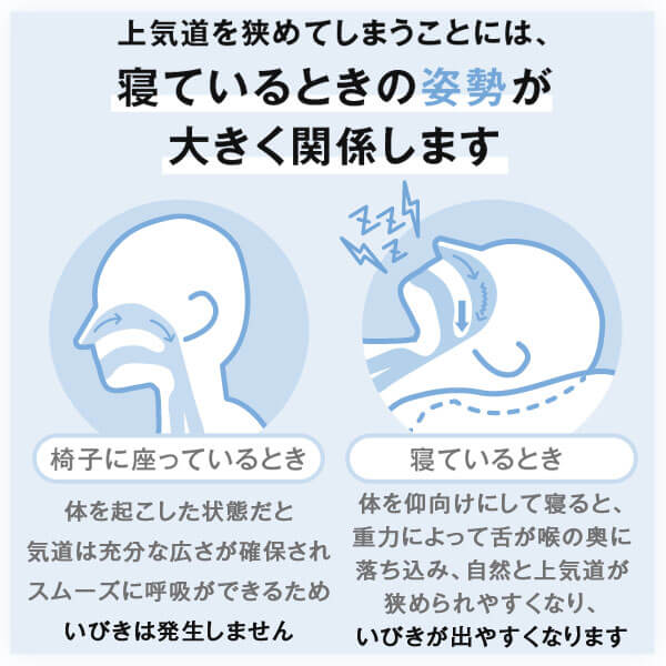 頸椎を高くし、気道を開きやすい状態に整え呼吸しやすい状態にすることでいびき防止に効果があります。